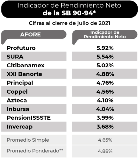 Afores con mayor rendimiento 2021. Por lo que para conocer los rendimientos de cada Afore ser necesario ubicar el grupo de edad al que pertenece el interesado. Al igual que en la Sifore bsica Profuturo tiene el mejor rendimiento cuenta con un 713 de rendimiento ms que Sura que suma 602 y Coppel alcanza el 599.